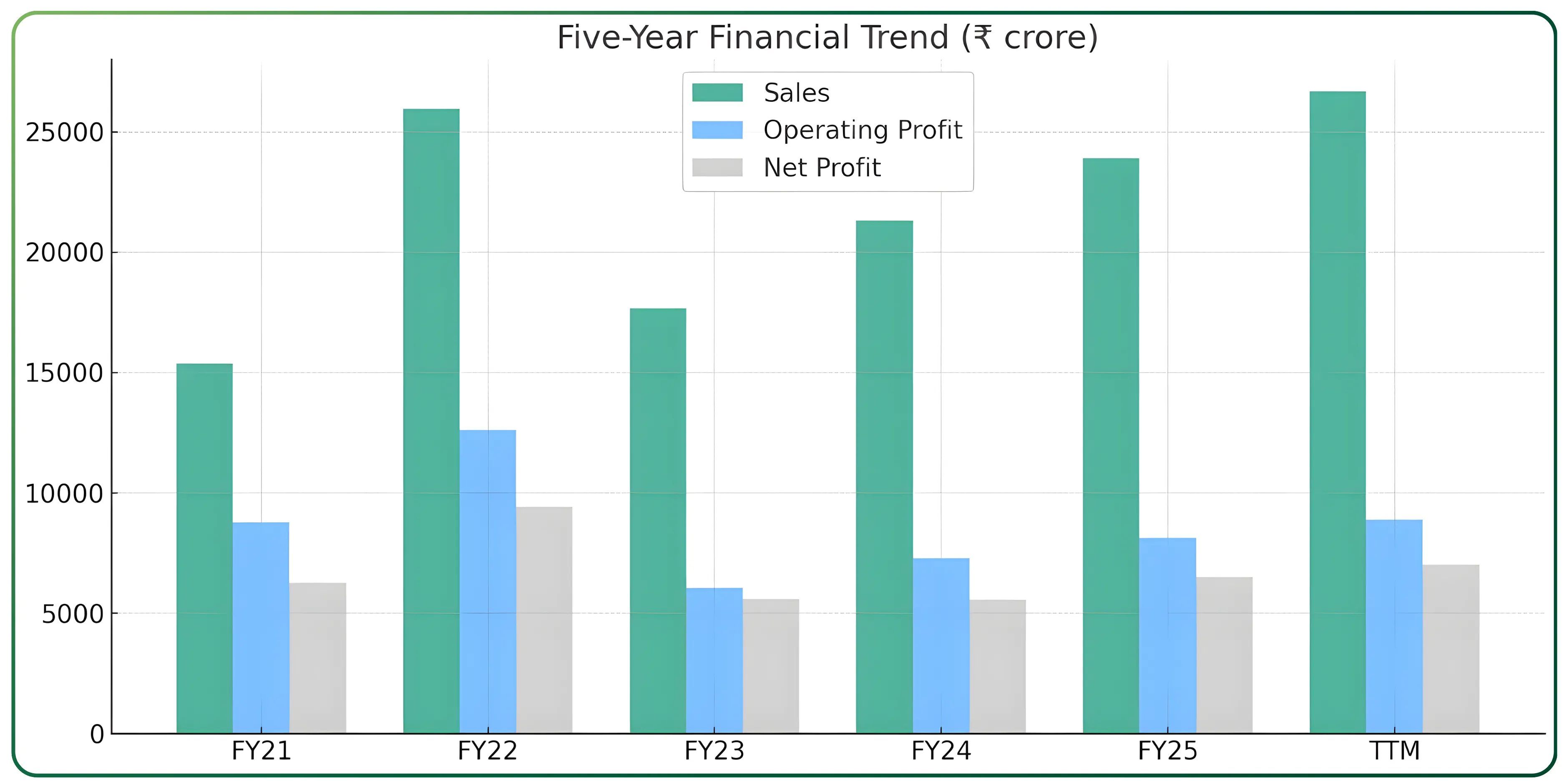 NMDC’s numbers tell a cyclical but structurally strong story. Revenue rose from ₹15,370 crore in FY21 to ₹26,689 crore on a TTM basis. The operating profit pattern mirrors commodity cycles: OPM expanded to 57% in FY21 and FY23, slipped to 34% in FY25, and currently stands close to 33% on a TTM basis. Despite these swings, profitability remains high because NMDC runs with a lean cost structure and benefits from economies of scale. Net profit moved from ₹6,277 crore in FY21 to ₹7,022 crore TTM, largely tracking the movement in realisations and levies. A closer look at NMDC financial performance FY25 FY26 shows rising volumes, stable realisations and a return to operating leverage as H1 FY26 delivered the best production in the company's history.