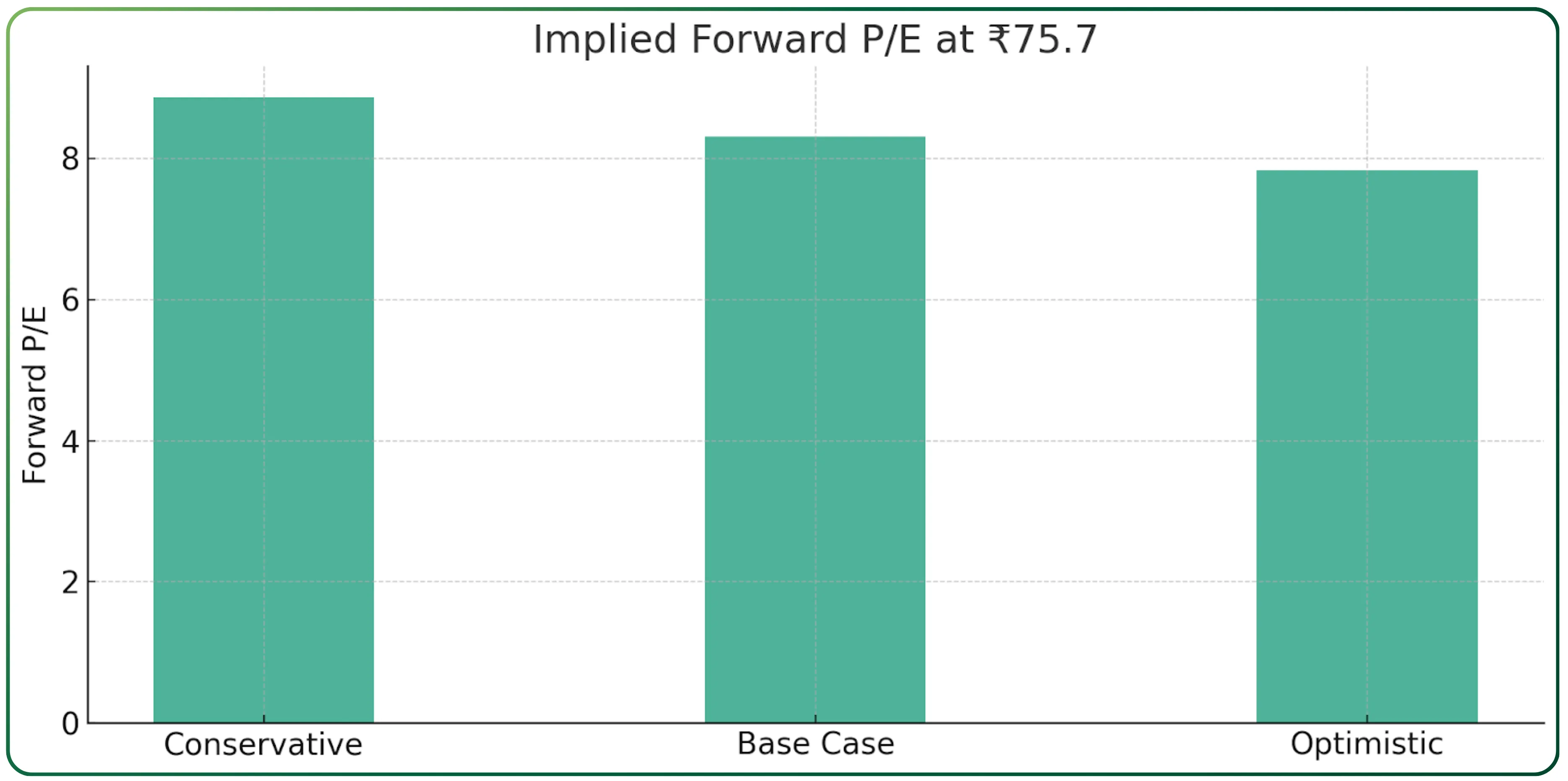 | Scenario | Forward PAT (₹ cr) | Forward EPS (₹) | Implied Forward P/E at ₹75.7 |