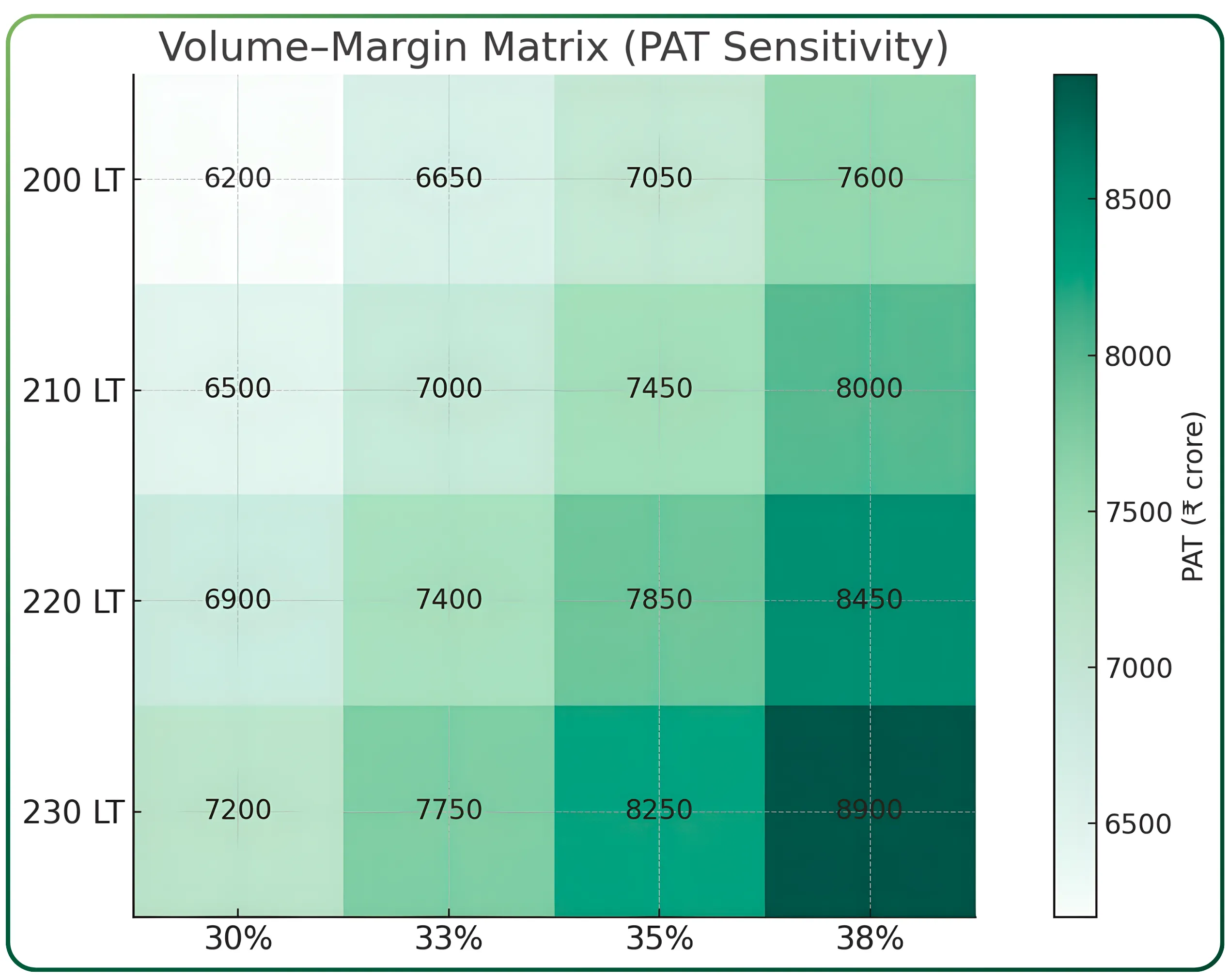 Iron ore mining is a simple business on the surface, but earnings can move sharply with changes in two variables: how much material is sold and the margin earned on every tonne. The volume–margin matrix shows how PAT reacts when these two levers move together. Higher dispatches add scale benefits, while margins largely follow realisations, costs, and levies. What the matrix reveals is that even small improvements in both can meaningfully expand PAT. At 220 LT and a 33% margin, NMDC can deliver around ₹7,400 crore in profit; the same volume at a 38% margin pushes profit toward ₹8,450 crore. This is why forward valuations for NMDC often appear conservative—small shifts in volumes or pricing translate into sizeable earnings upgrades.
