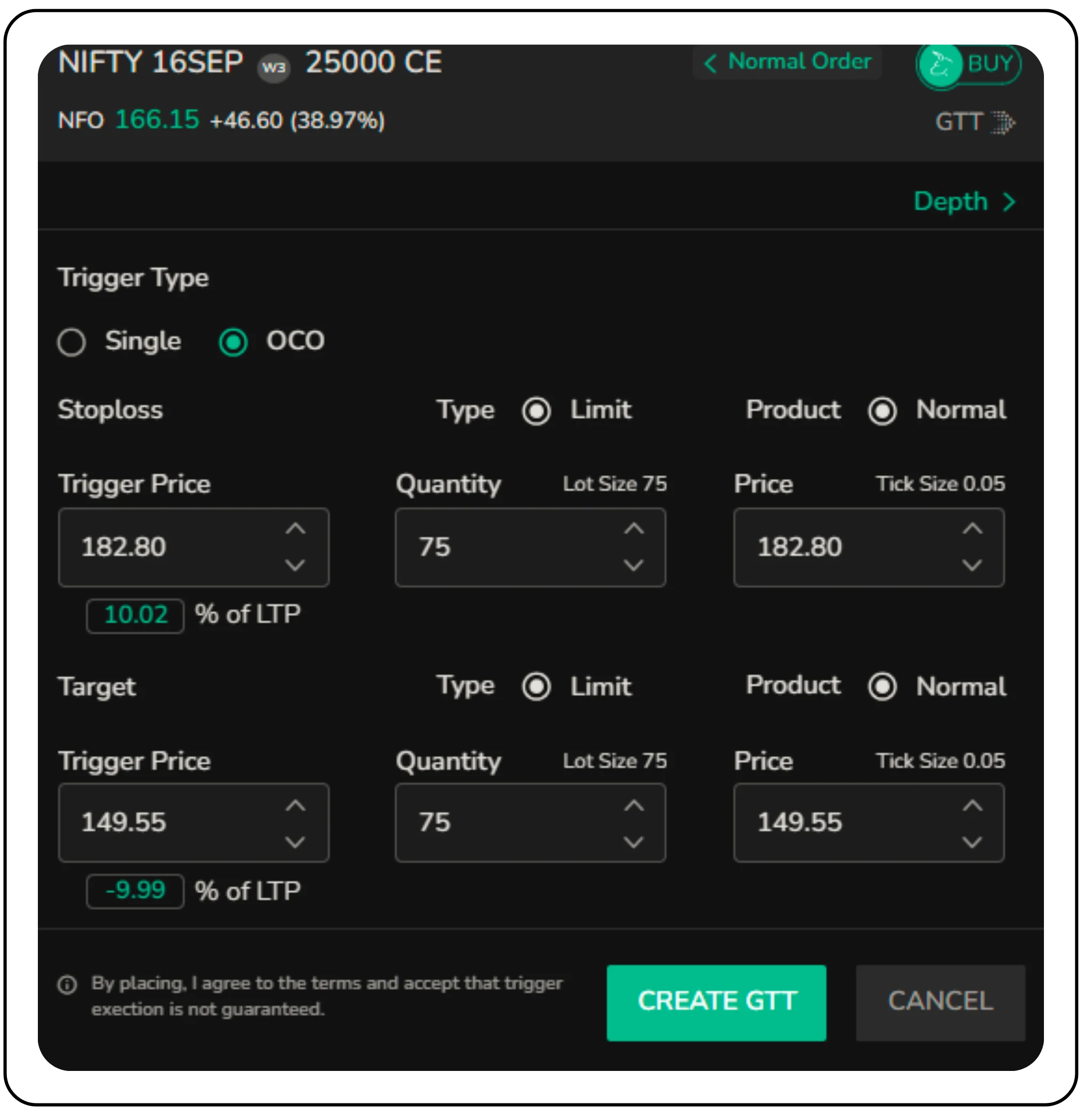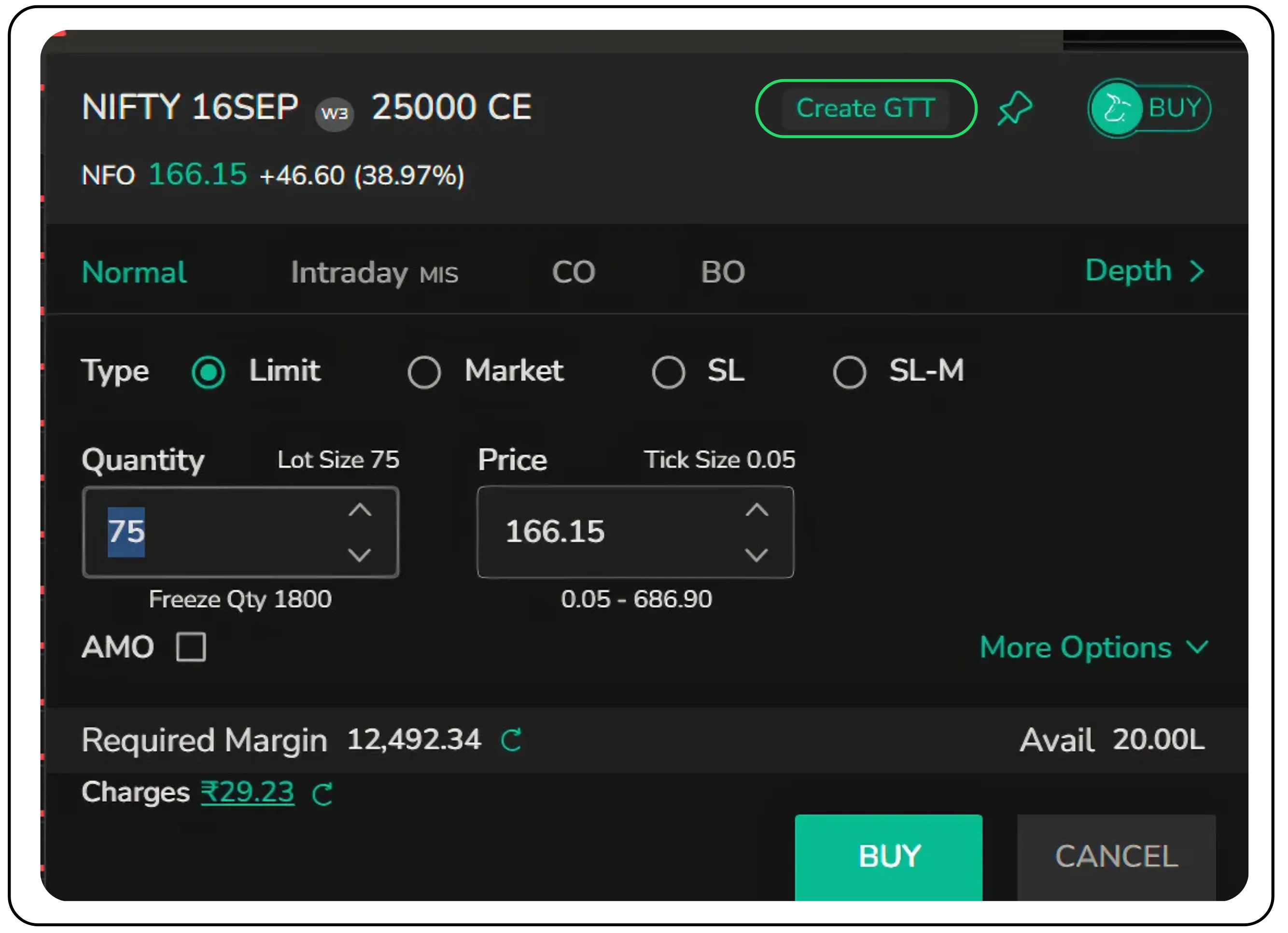 - Detailed order placement: The order window provides you with full control over your trade. You can place Limit, Market, Stop Loss (SL), and Stop Loss-Market (SL-M) orders with ease. You can also view the required margin and available funds before placing a trade.