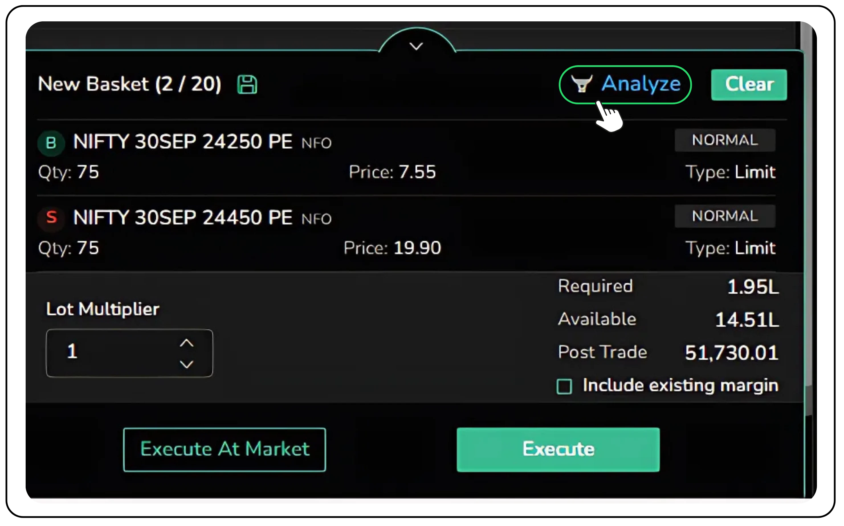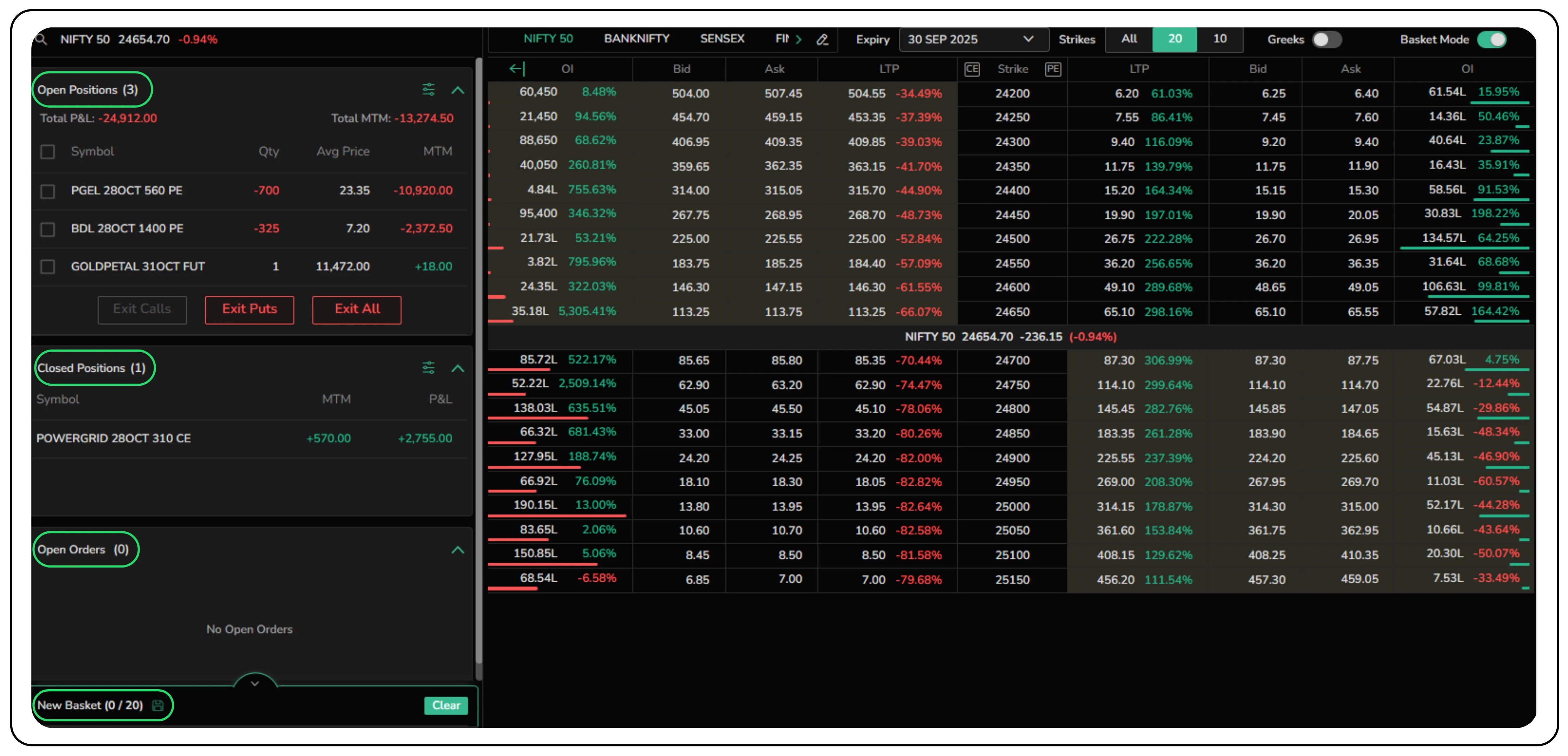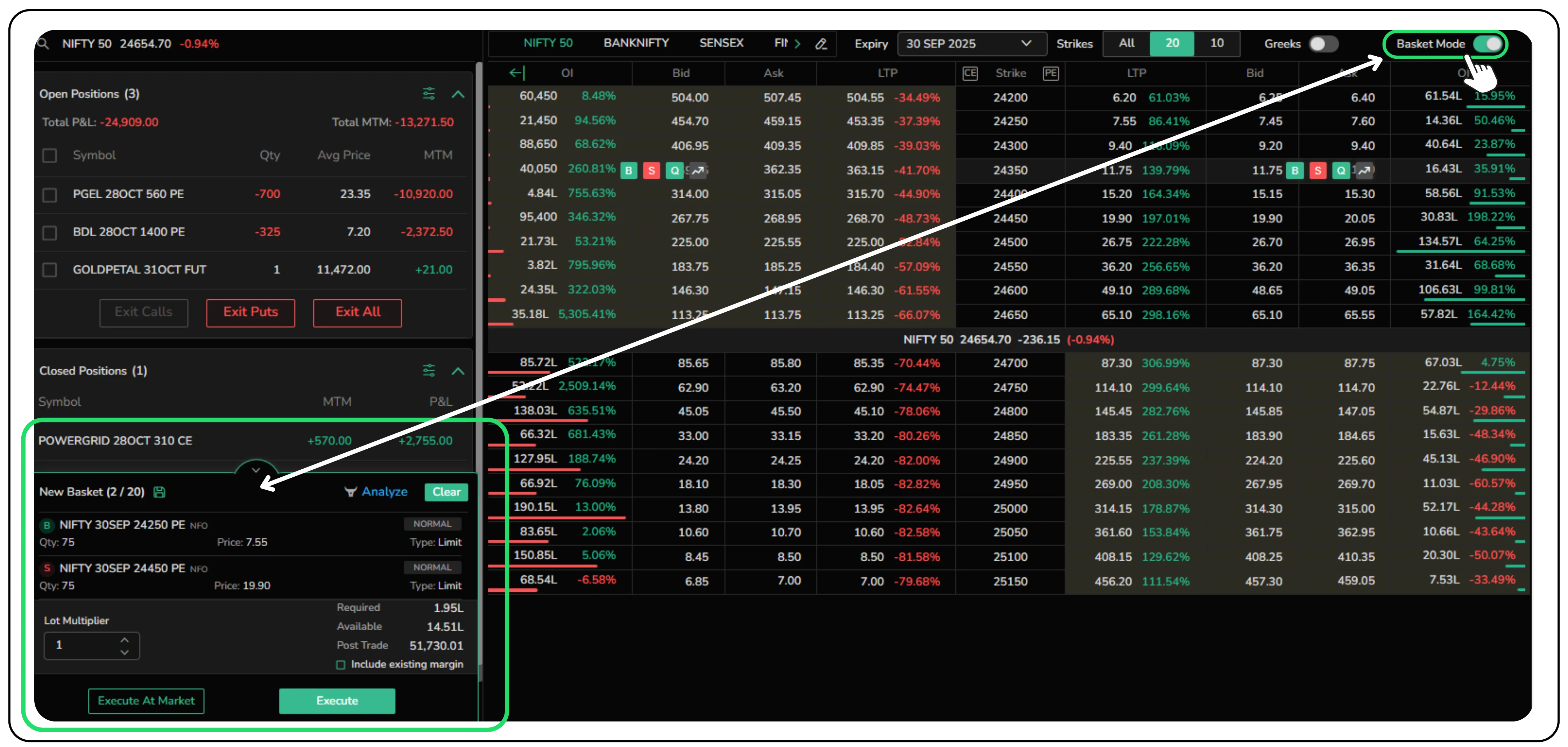 - Basket mode: Add multiple buy and sell legs in one go to execute straddles, strangles, or spreads efficiently. With a single toggle, you can add multiple buy and sell orders to a basket. This is perfect for executing complex strategies like straddles, strangles, or spreads in one go.