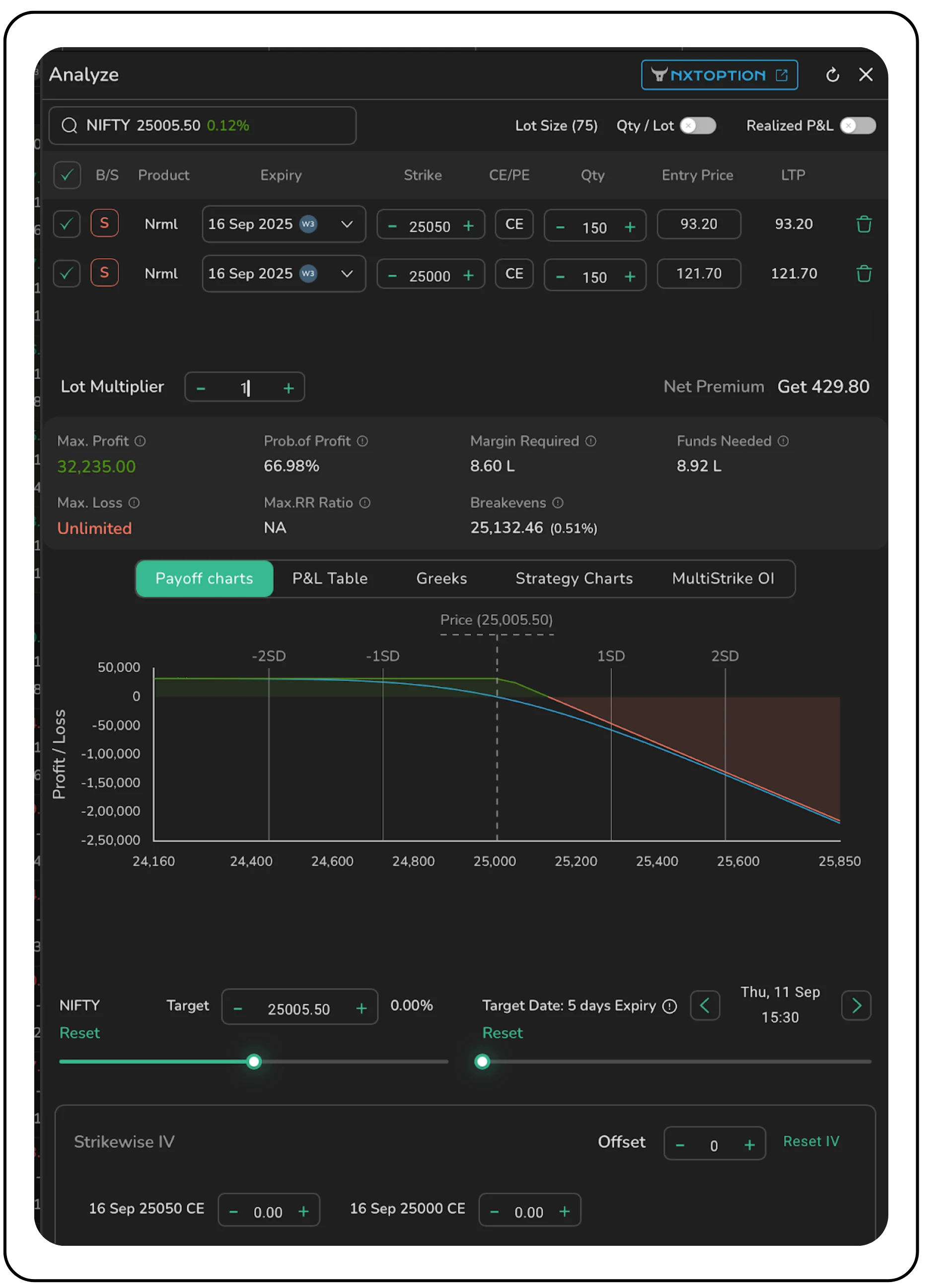 - Strategy analysis: When using Basket Mode, the "Analyze" button opens a detailed pop-up. This includes a complete payoff chart for your strategy, a detailed P&L table, and a breakdown of the strategy's Greeks. This allows you to visualize your potential profits, losses, and breakeven points before you commit your capital.