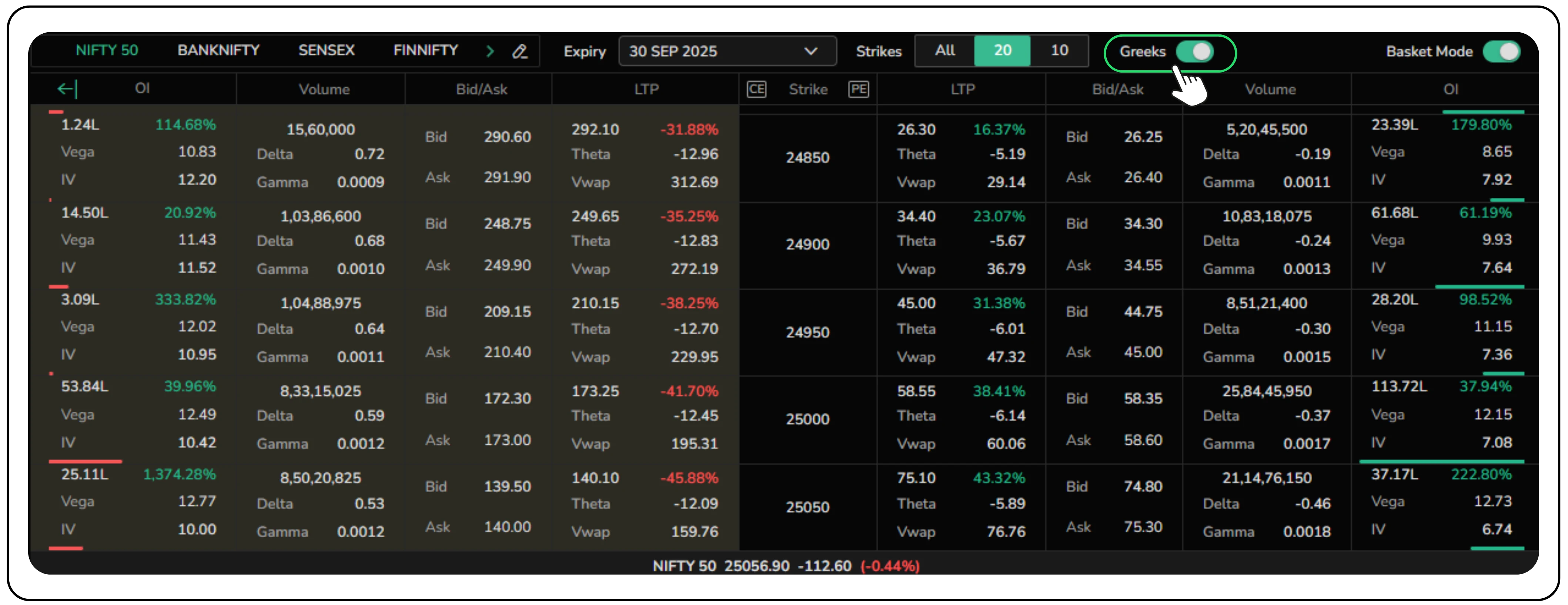 - Integrated option greeks: Expand the option chain to view Delta, Gamma, Theta, Vega, and Implied Volatility (IV) for every strike.