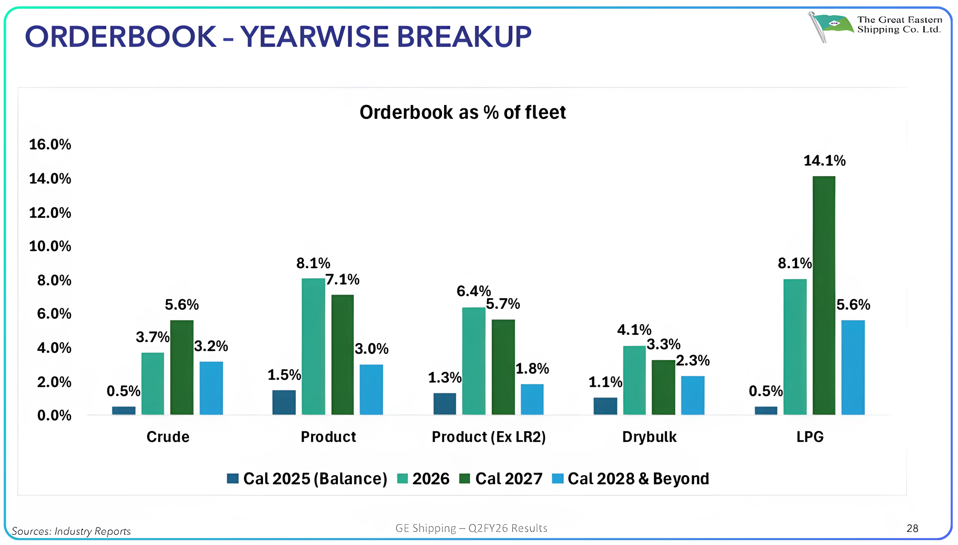 The chart shows how much new vessel capacity is scheduled to enter the global fleet across crude tankers, product tankers, dry bulk, and LPG carriers. Product and LPG segments have the strongest pipeline, with future deliveries forming a sizable share of their existing fleets, reflecting higher demand expectations. Crude and dry bulk order books remain relatively low, indicating a more disciplined supply outlook in those markets. Overall, the chart highlights where new shipping capacity is concentrated and which segments are set for faster fleet expansion over the next few years.