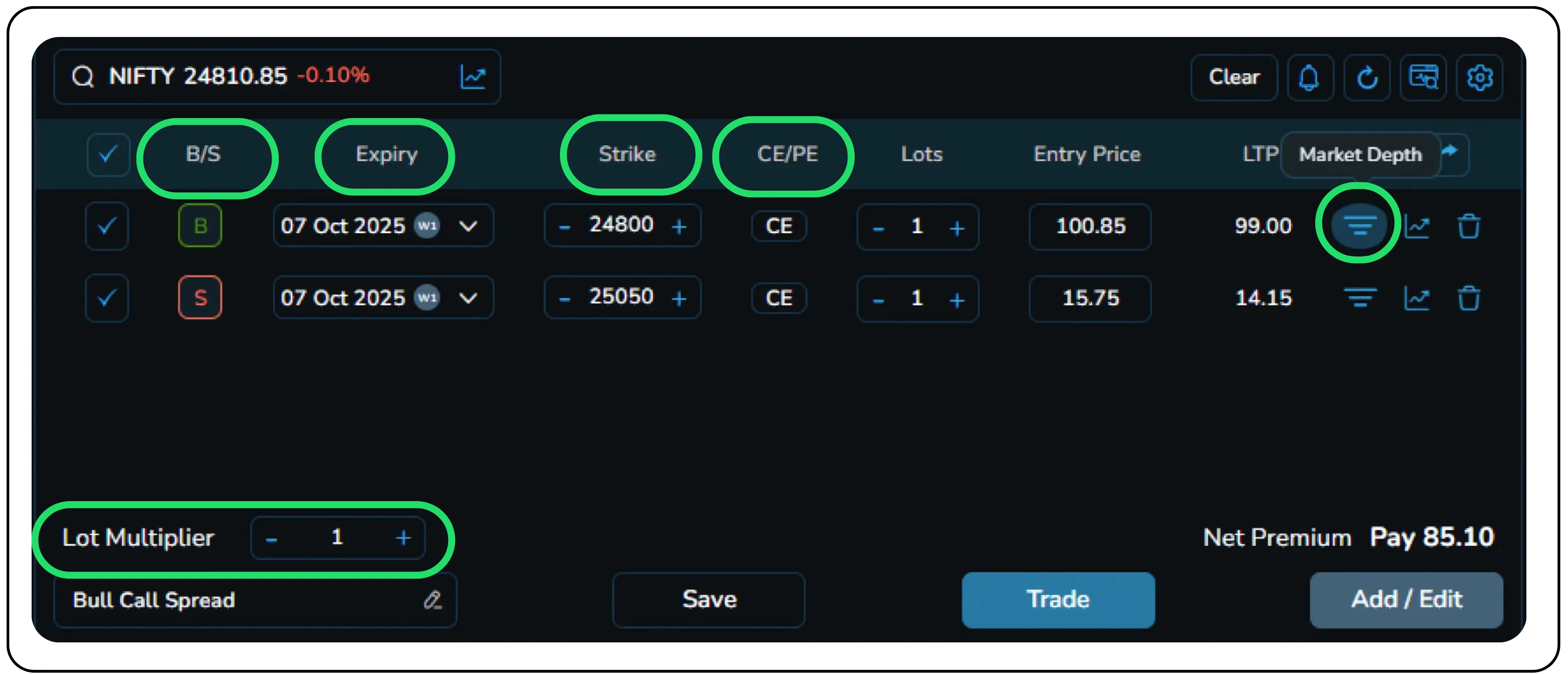 - Net Premium: ₹85.10 — clearly displayed as the total cost of the strategy
