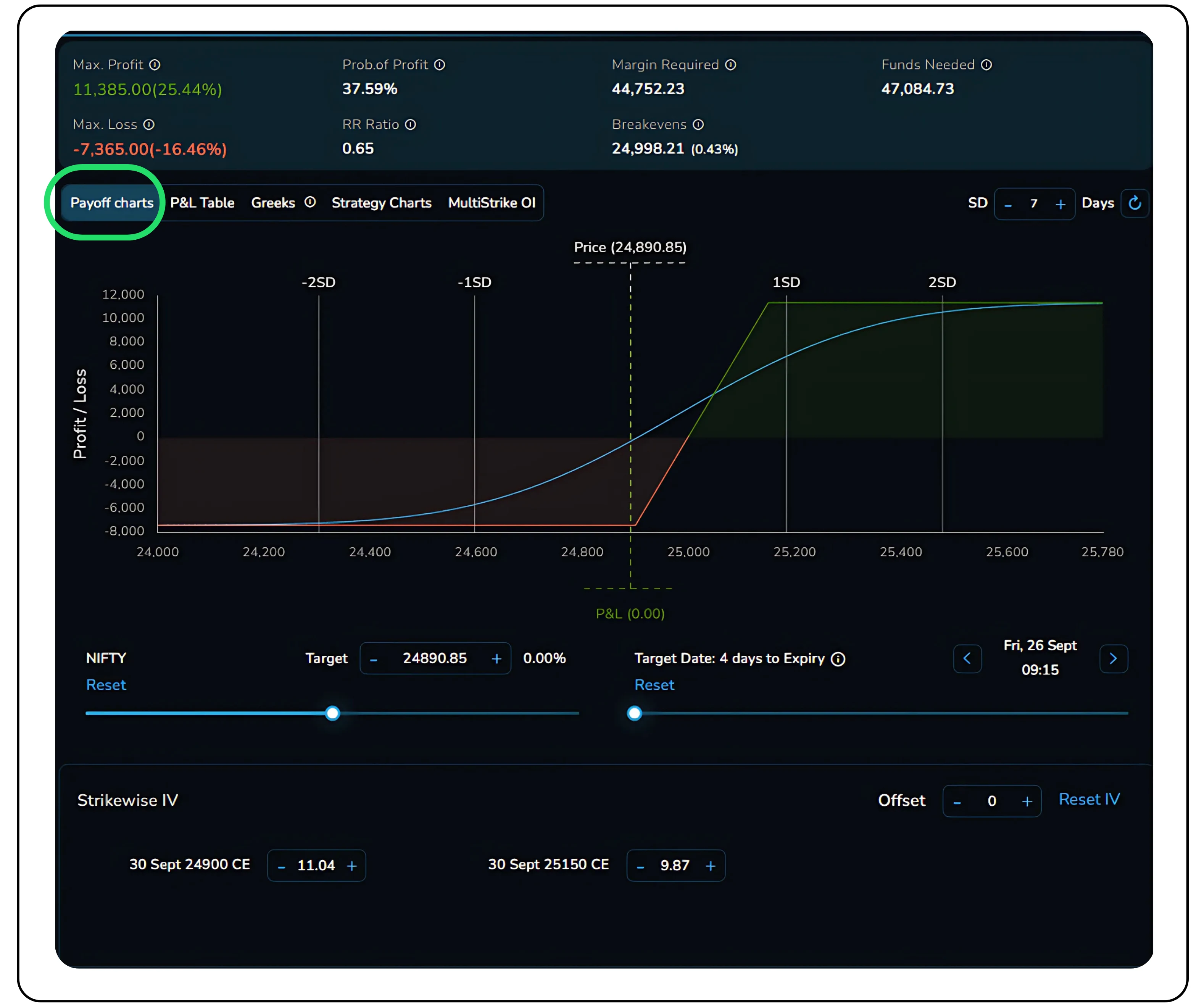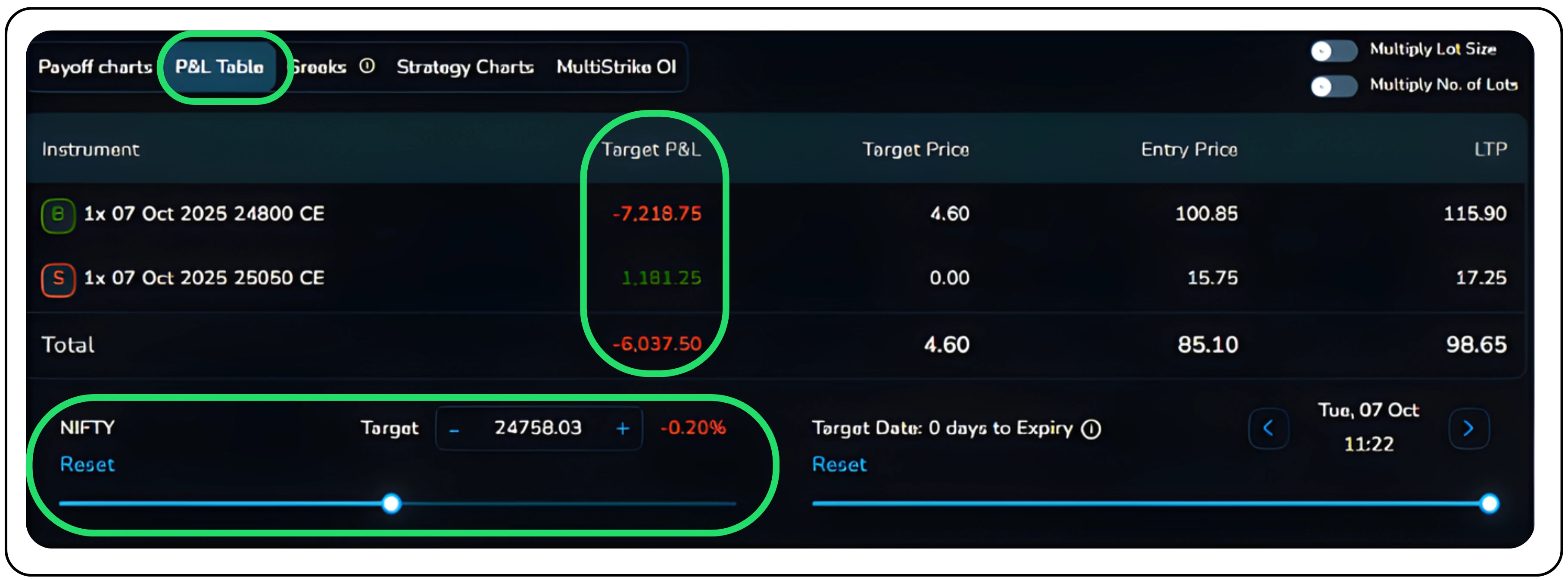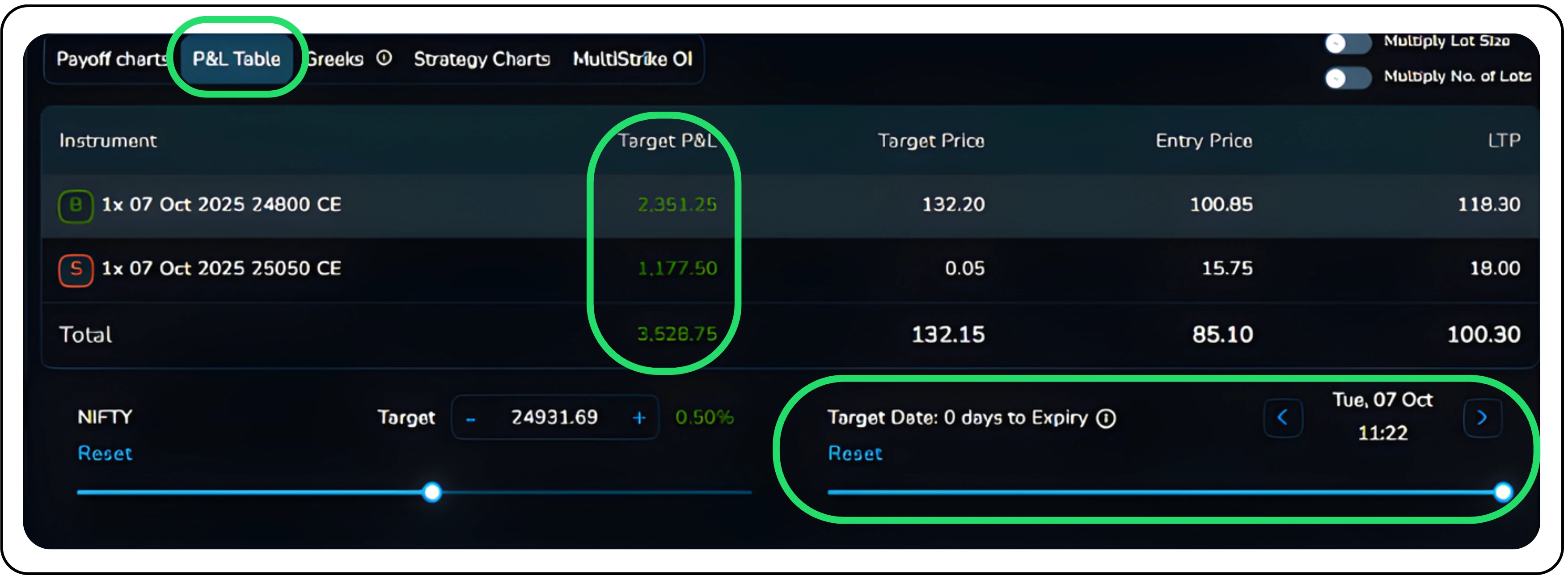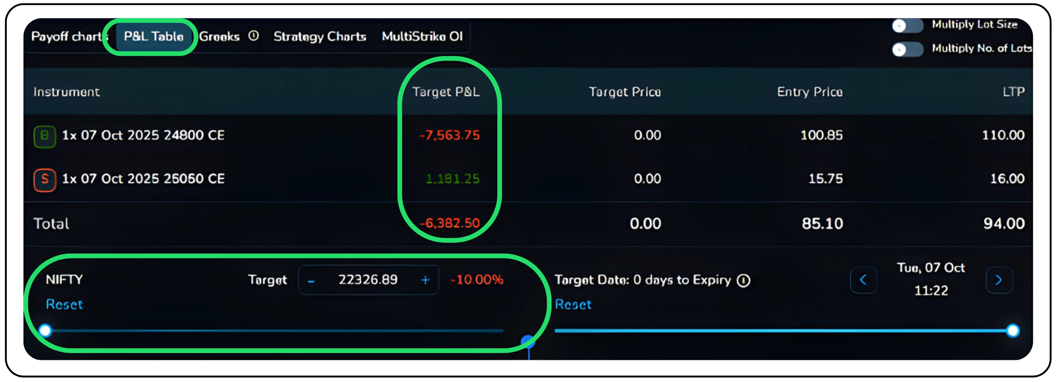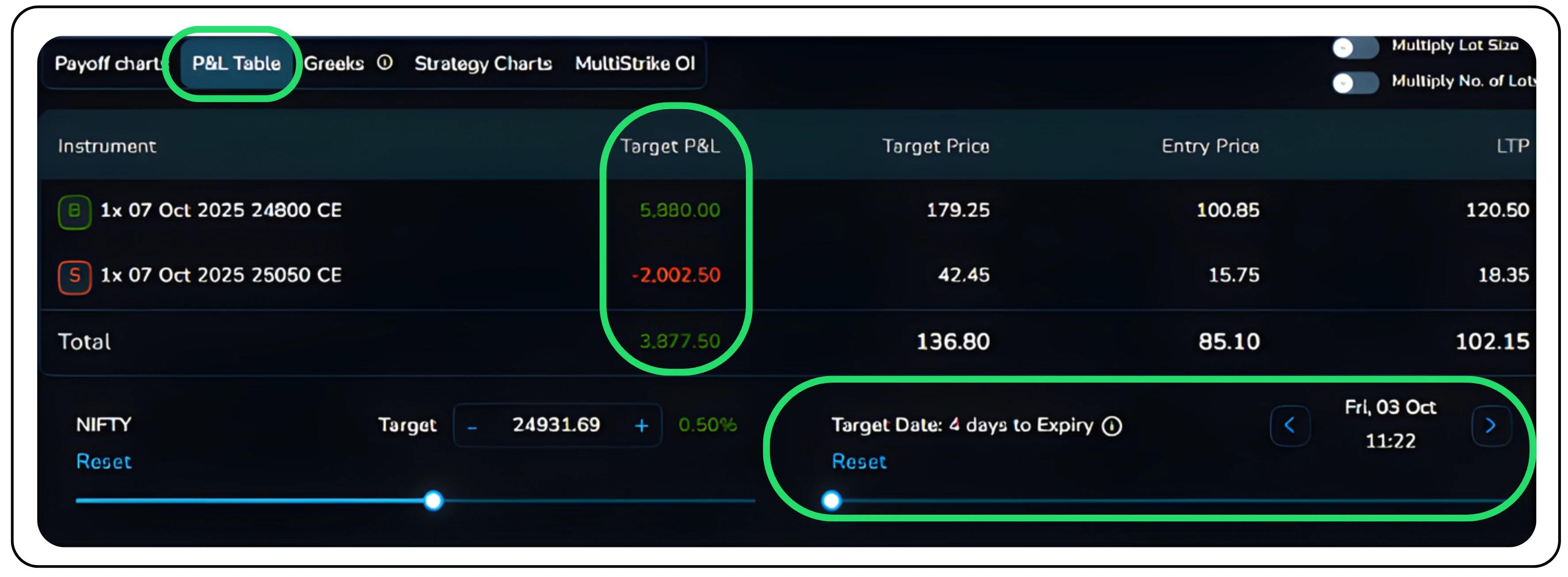 By dragging and selecting the Target Price and Target Date bars, users can simulate profit and loss based on expected market movements and observe how the timing of these movements impacts potential gains or losses.