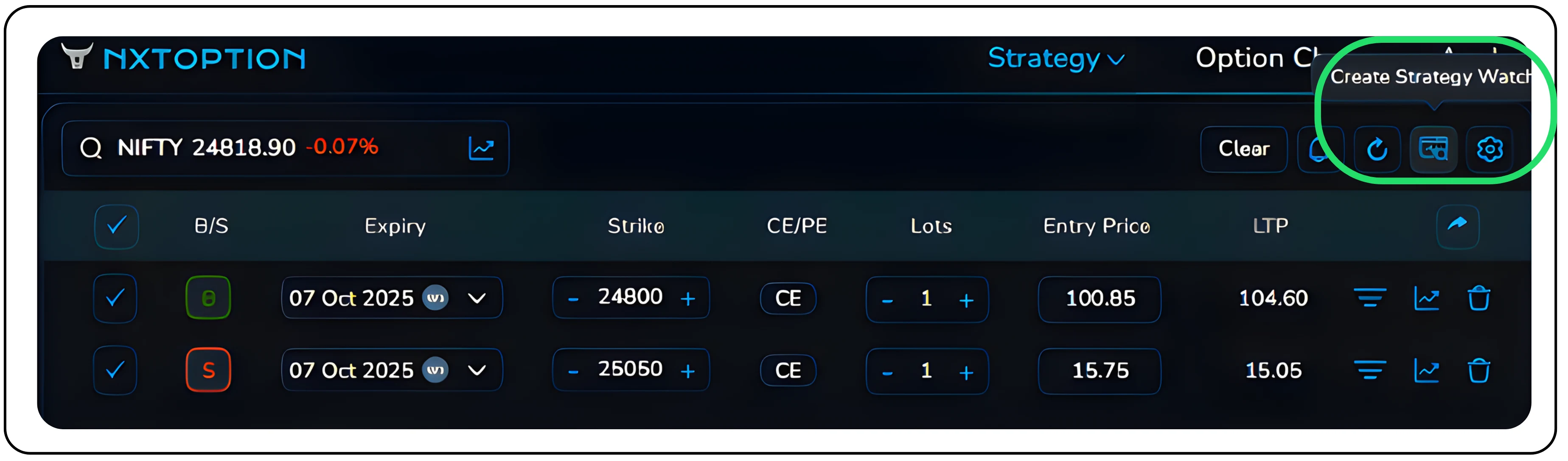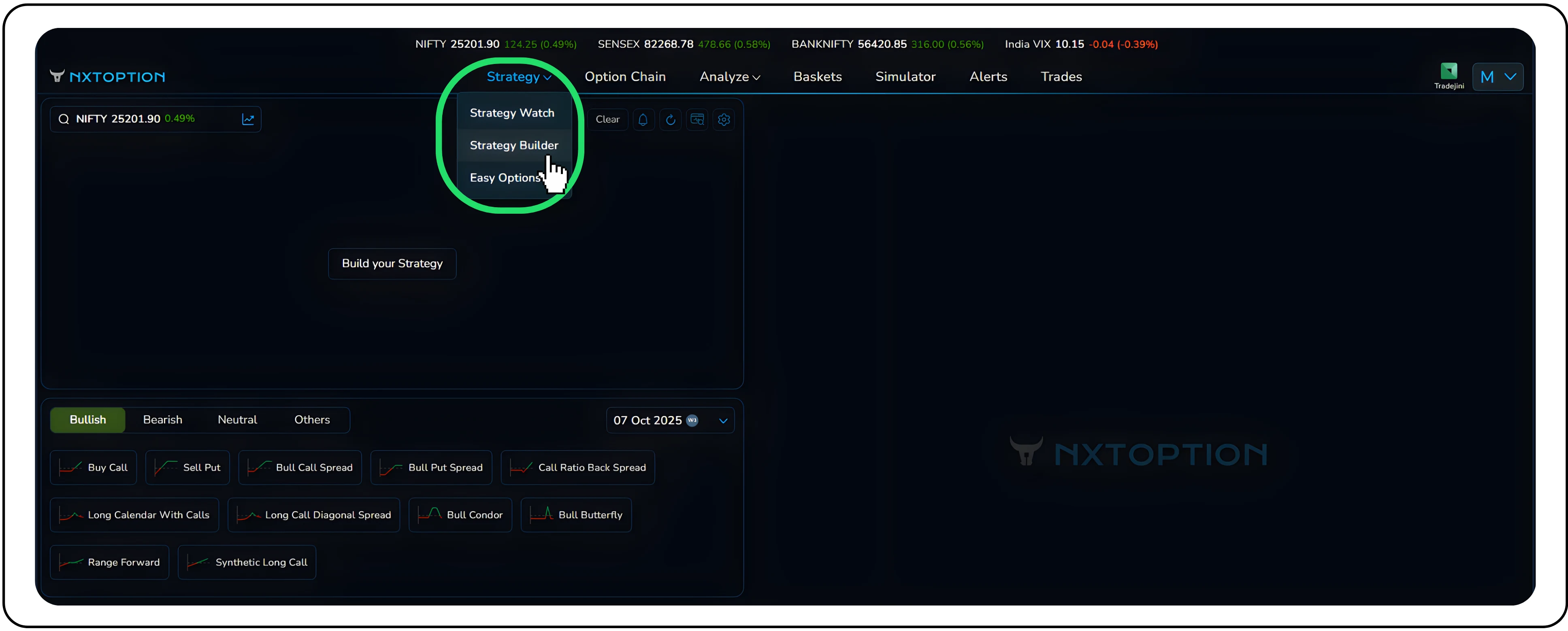 An Options Strategy Builder is a powerful tool that simplifies complex options trading by automating strategy creation, analysis, and execution, all in one place. It gives traders a single platform where complex strategies can be created, analyzed, and executed in seconds. Instead of juggling spreadsheets and multiple order placements, just a few clicks, and your strategy is ready. The NxtOption allows you to structure advanced strategies with just a few clicks, bringing institutional-grade tools to everyday traders.