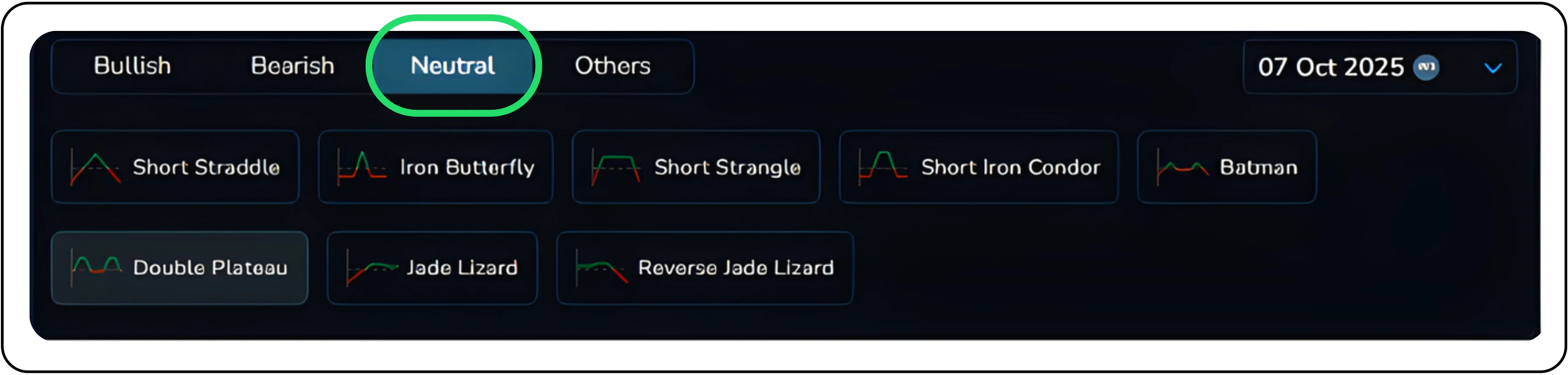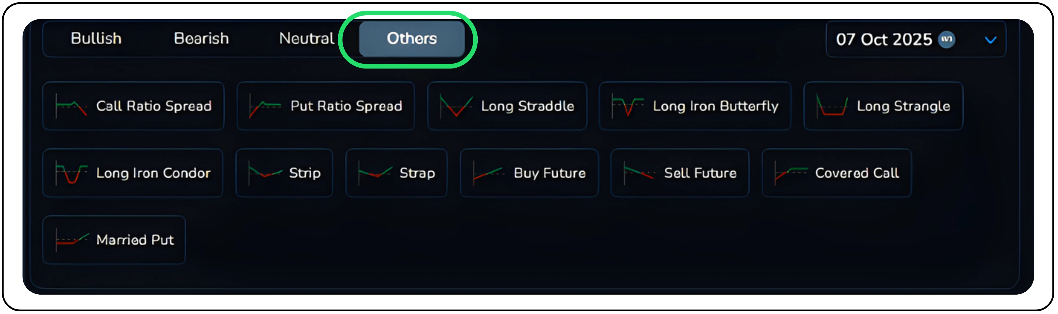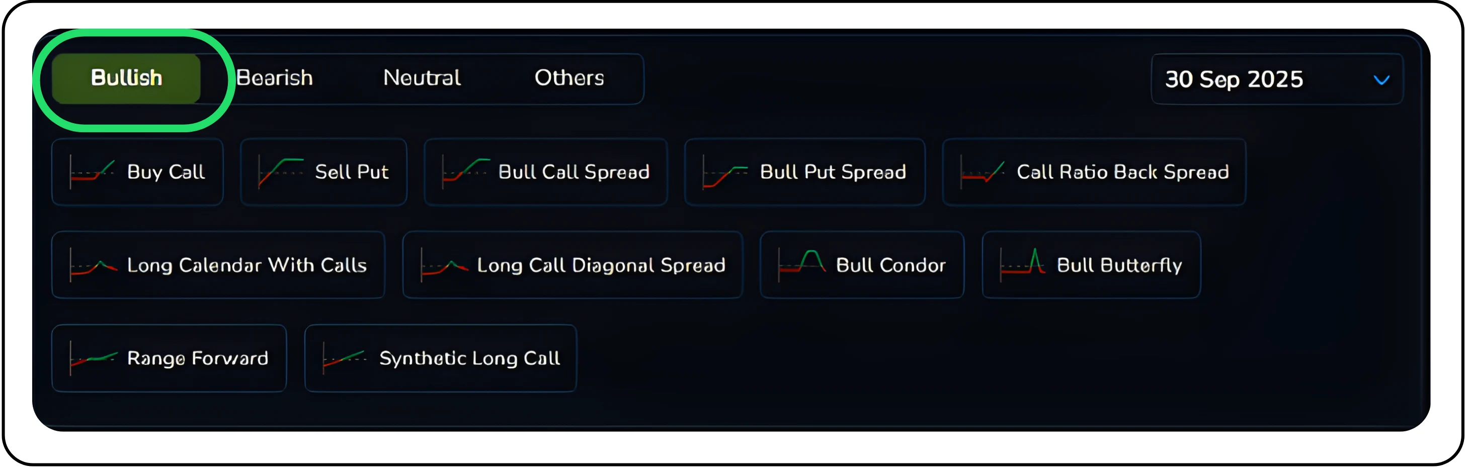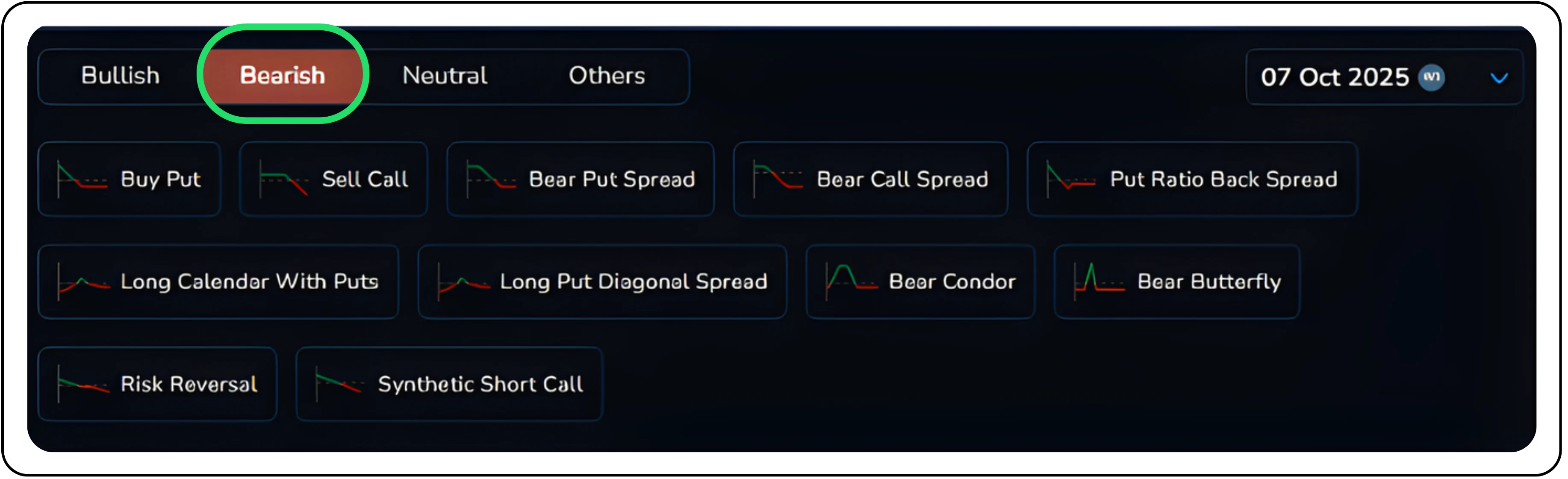 Easily access ready-made strategies, sorted by market outlook, be it bullish, bearish, neutral, or advanced Multi-Leg Options setups. The Strategy Library includes: