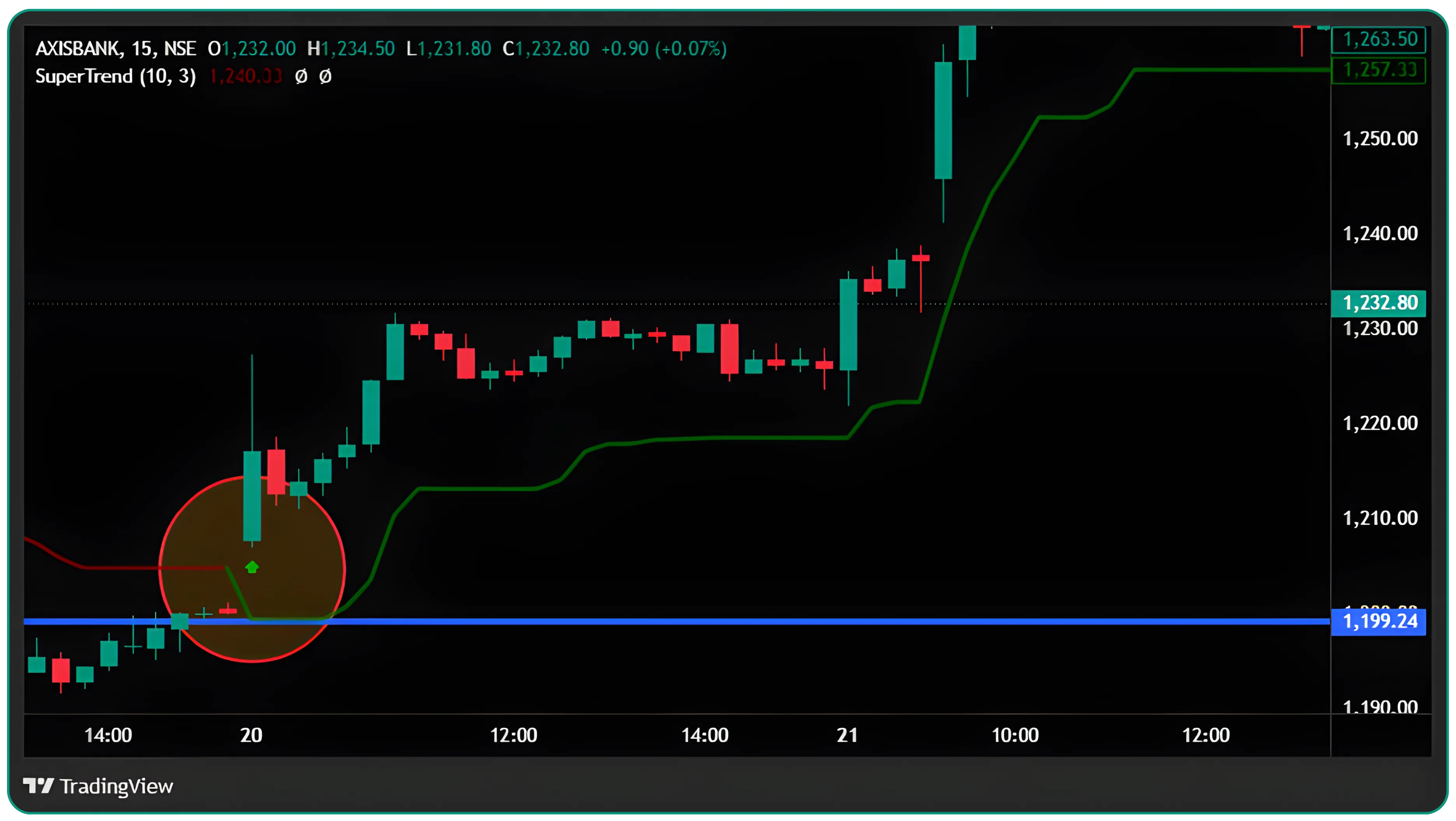 If the XYZ price goes above ₹50,600, the Supertrend Indicator turns into a green line, this signals you to buy.