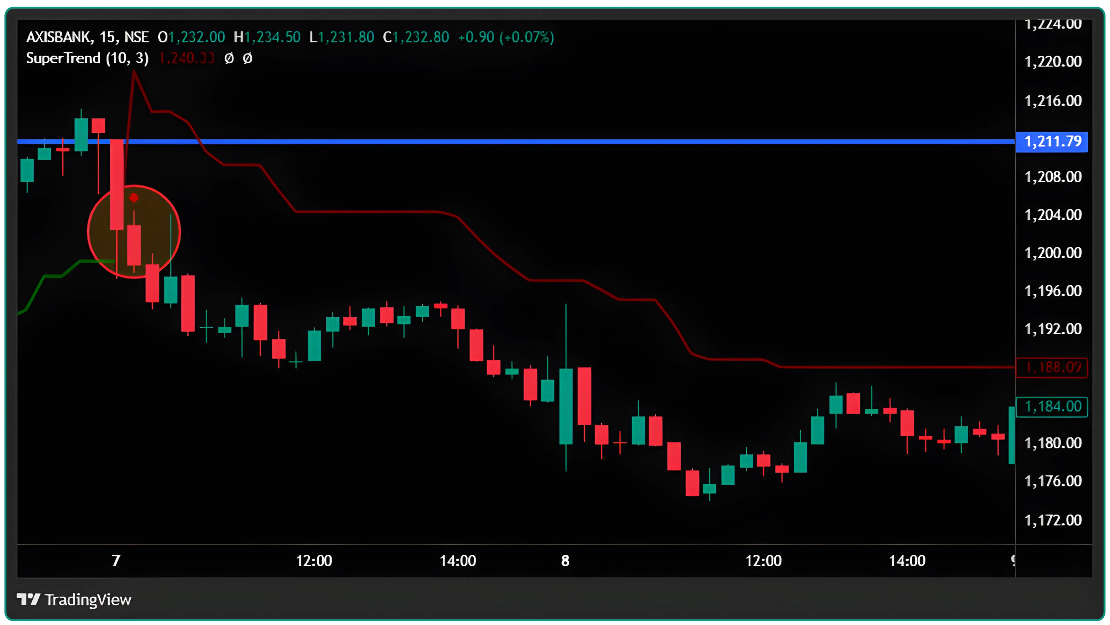 If the price drops below ₹49,400, the Supertrend Indicator turns into a red line, this signals you to sell or stay cautious.