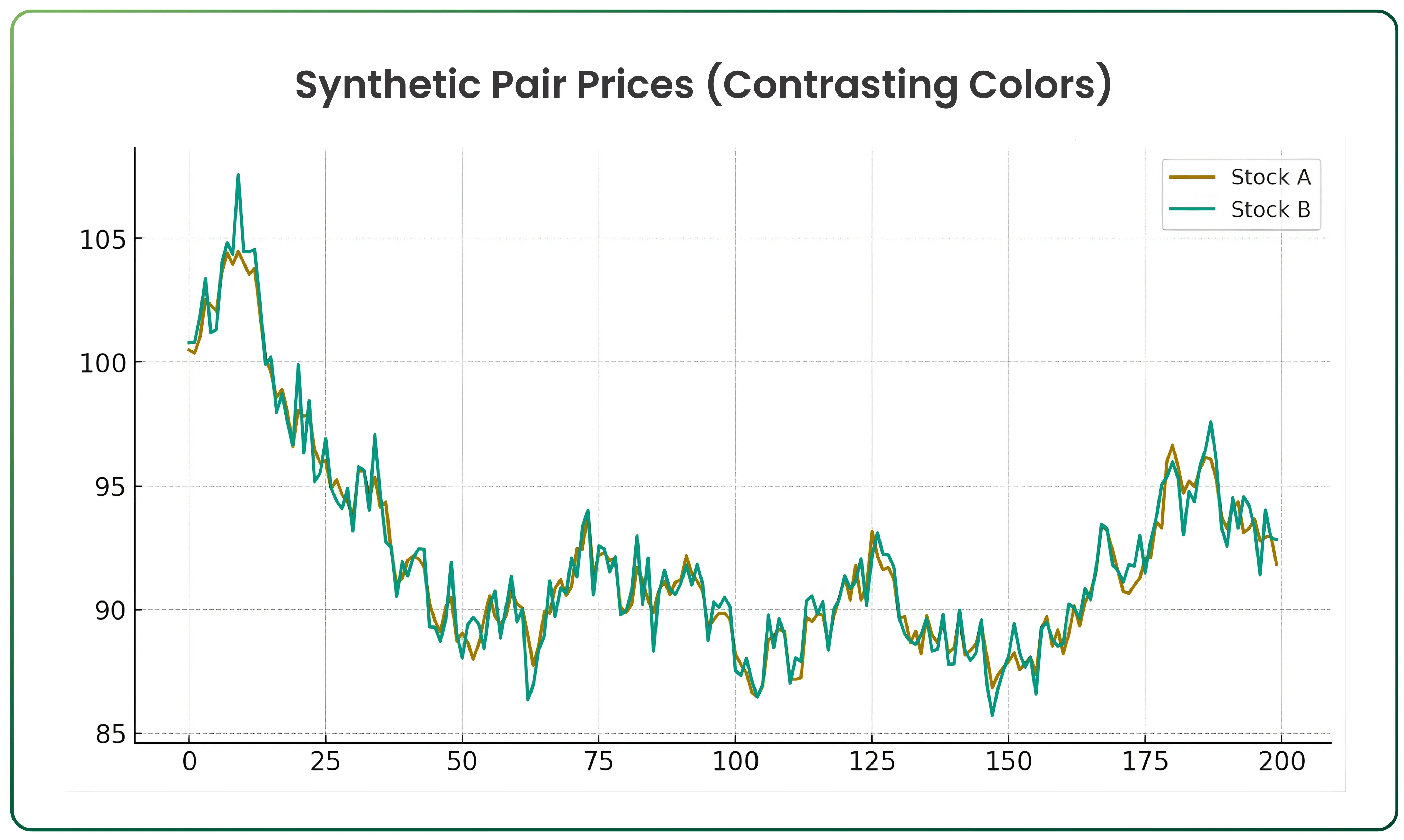 Below is a first chart showing how two synthetic stocks move almost in lockstep over time. This kind of tight co-movement is exactly what traders look for when selecting a pair.