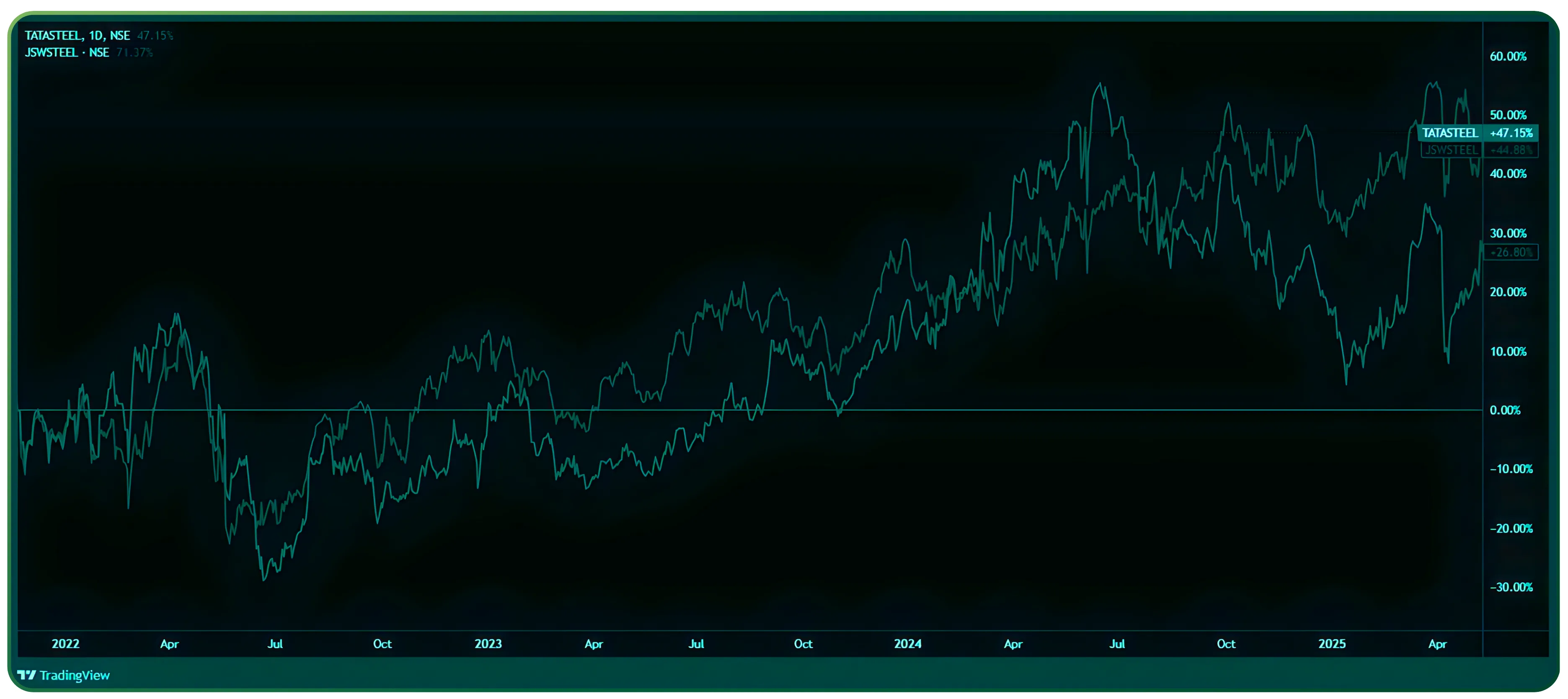 Let’s take Tata Steel and JSW Steel, two companies with similar sector drivers and cost structures. Historically, their price movements track each other closely.
