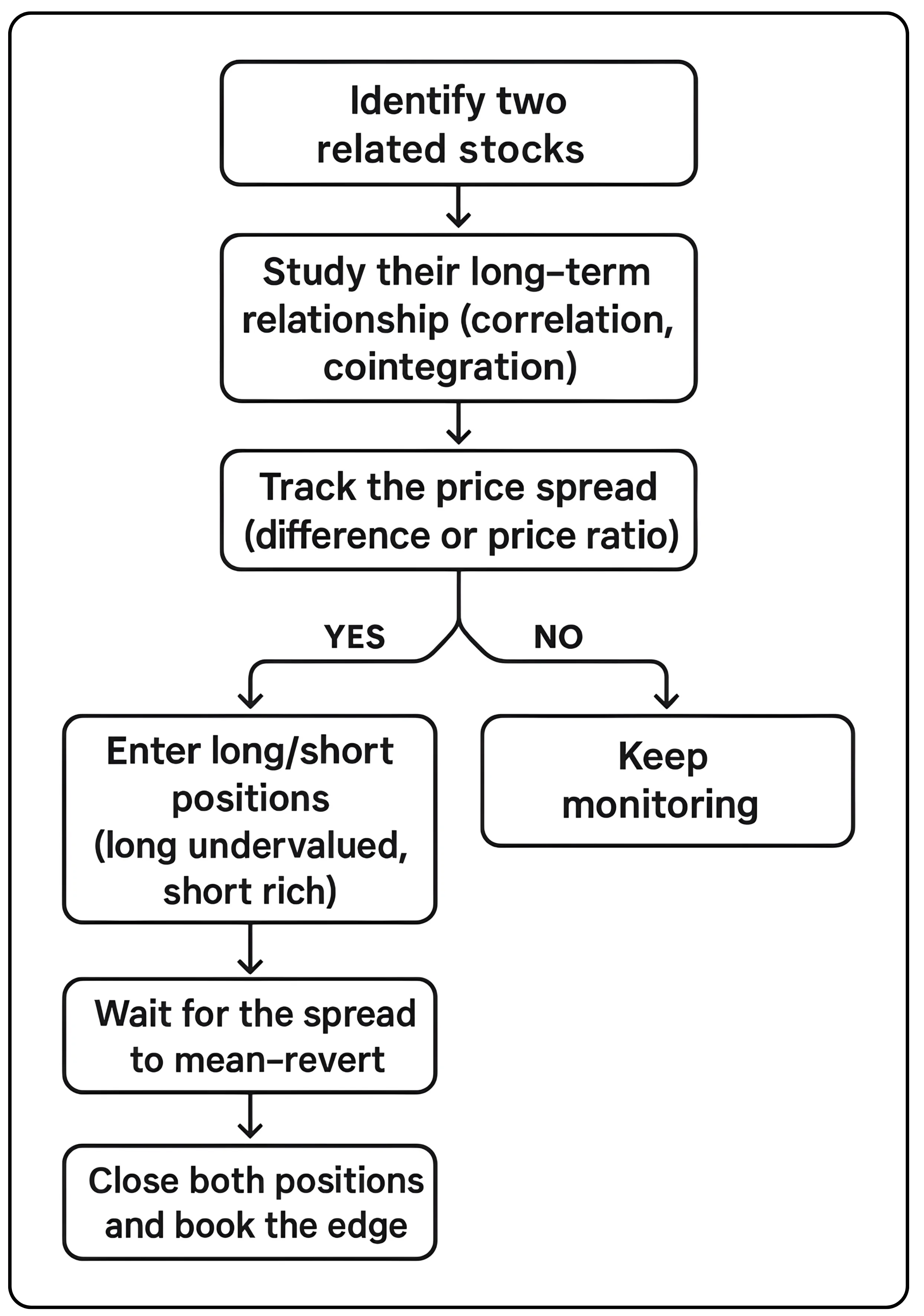 Every now and then, one stock races ahead or falls behind. That stretch in the “rubber band” is what pair traders look for. If two stocks are normally close and suddenly diverge more than usual, the odds of them drifting back toward their historical equilibrium are high. You don’t predict the broader market. You only care about the relationship between the two stocks.
