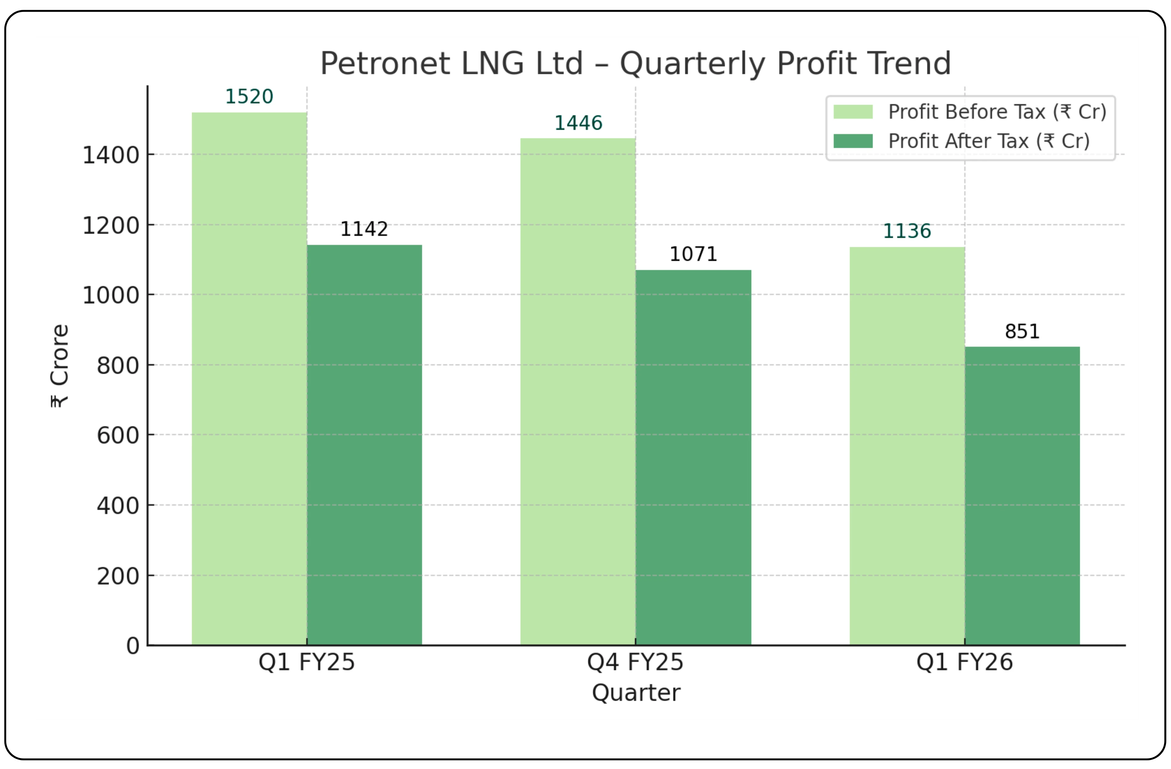 Petronet LNG’s Q1 FY26 results highlight a mixed quarter steady operational gains amid weaker profitability. Profit Before Tax came in at ₹1,136 crore, down 21.4% sequentially from ₹1,446 crore in Q4 FY25 and 25.3% lower year-over-year from ₹1,520 crore in Q1 FY25.