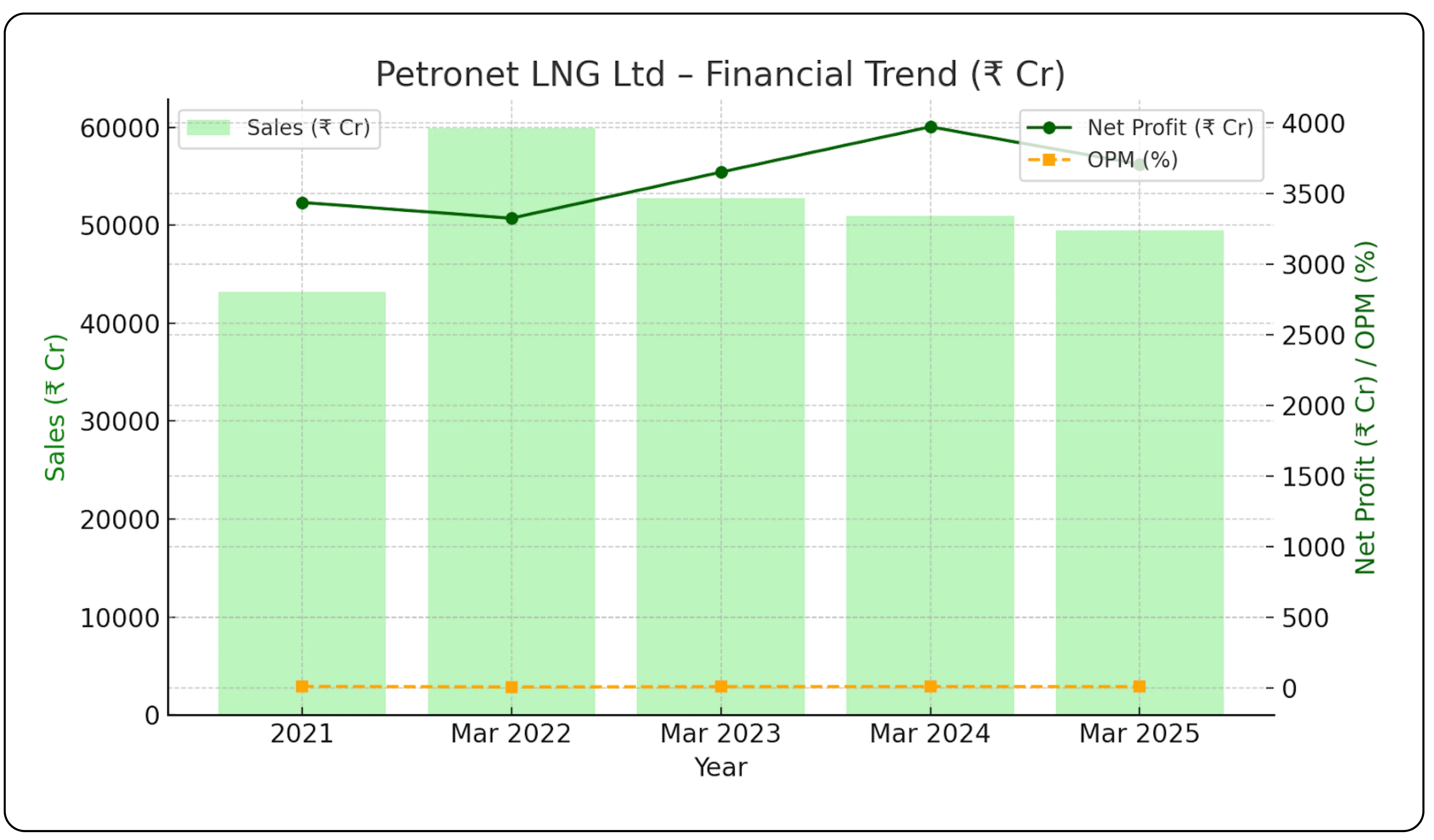 - Revenue: Sales peaked in FY2022 at ₹59,899 crore, fueled by elevated global LNG prices, before gradually easing to ₹49,447 crore in FY2025 as prices normalized.
