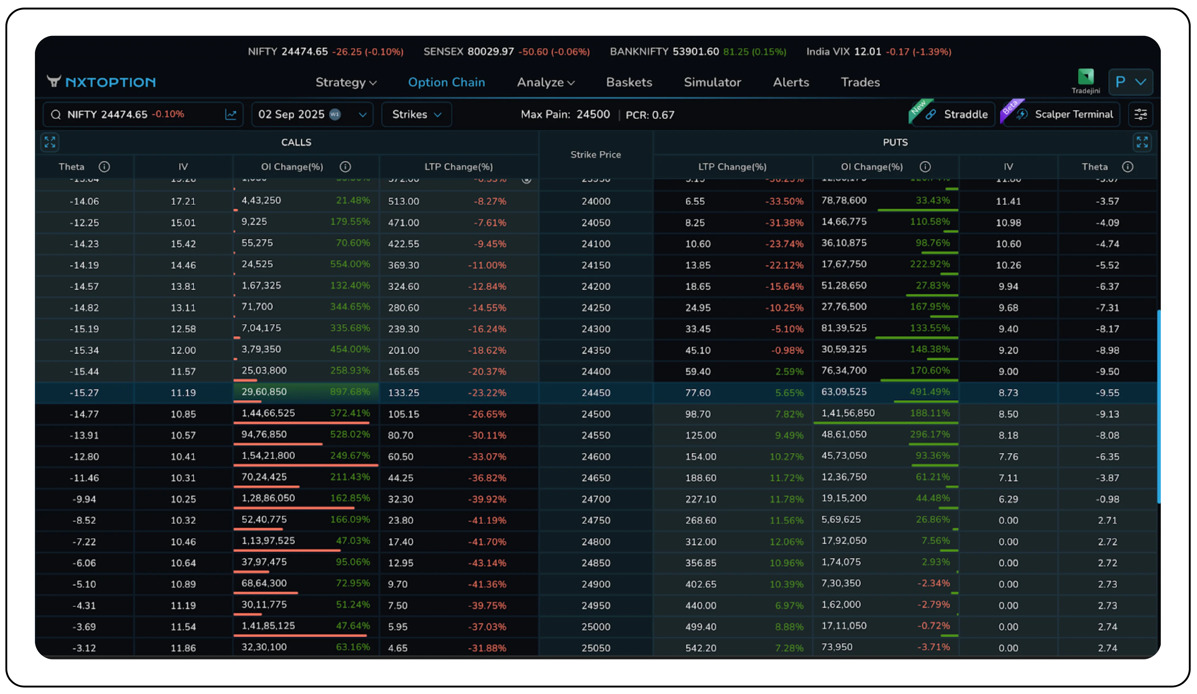 As of 29 August 2025, NIFTY is trading around 24,475. Looking at the option chain for the 02 September 2025 expiry, the following strikes illustrate how Theta plays out in practice: