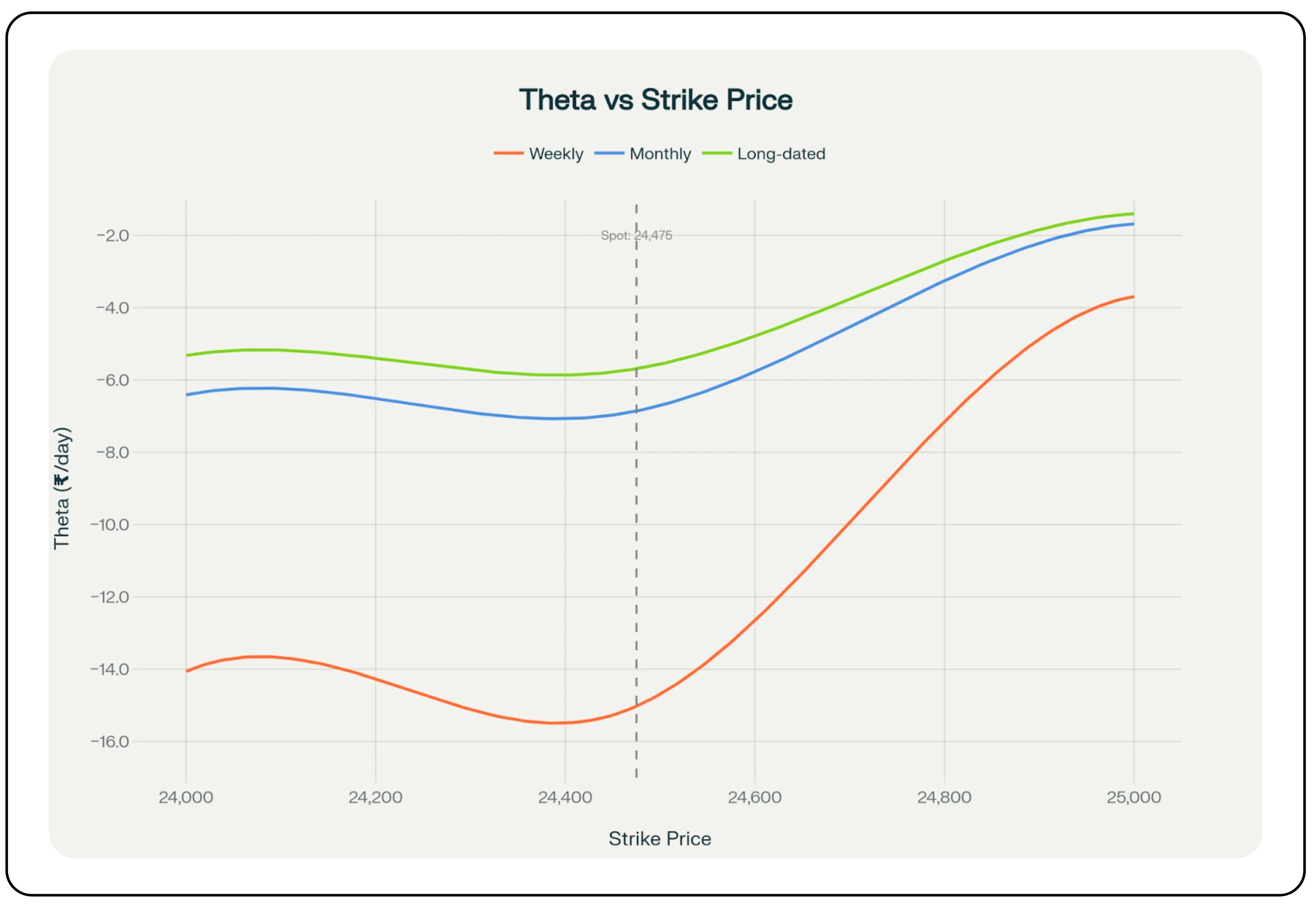 ATM options experience the highest rate of time decay. This is because they are made up almost entirely of time value rather than intrinsic value. As expiry approaches, this time value evaporates rapidly. In the option chain, the call option with a strike of 24,450, trading close to spot at 24,475. In expiry week, its premium stands at ₹133.25 with a theta close to -15.27. This means the option loses roughly 11% of its entire value every single day, a steep erosion. This happens because the market is constantly reassessing whether the option will expire ITM or not. With limited time left, the probability window narrows sharply, and thus, the premium has no choice but to collapse. - Out-of-the-money (OTM): Slow, Then Sudden OTM options carry lower theta compared to ATM, but their decay is a little deceptive. Early in the expiry cycle, OTM premiums appear to hold “value” as traders speculate on potential moves. However, as expiry nears, these premiums can collapse overnight because there is no intrinsic value to cushion them. In the option chain, the call option with a strike of 25,000 with the same spot as before is priced at ₹5.95 but has a theta of -3.69, which means that the option will lose the entirety of its value within two days. For OTM options, the risk is not gradual erosion but the cliff-like fall in the final hours of trade.