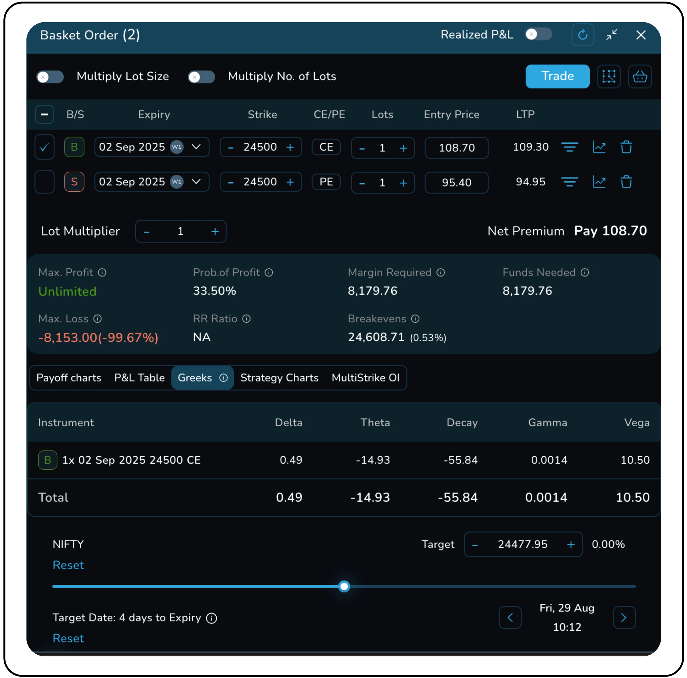 When holding long calls or puts, Theta acts as a relentless adversary. Each day that passes without a decisive move in the underlying erodes part of the premium paid, irrespective of the correctness of the directional view. A trader buys the NIFTY 24,500 CE (weekly expiry, 2 Sep 2025) for ₹108.70. The Theta associated with this position is approximately –14.93. This implies that, if the underlying remains stagnant, the option loses nearly ₹15 in value daily. Over four days, this amounts to almost ₹60 of decay, or more than 50% of the premium.