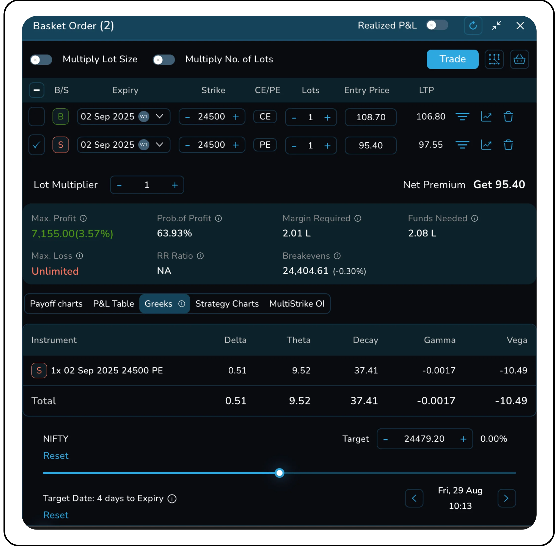 For option sellers, Theta is the equivalent of collecting rent every day the market remains in a narrow range. Every passing day without major movement works in their favor. A trader sells the NIFTY 24,500 PE (weekly expiry, 2 Sep 2025) at ₹95.40. The Theta here is +9.52, meaning the position earns close to ₹10 per day as long as prices hold steady above the strike. In four days, this could translate to nearly ₹38 per lot, adding up to ₹1,900 on a 50-lot contract.